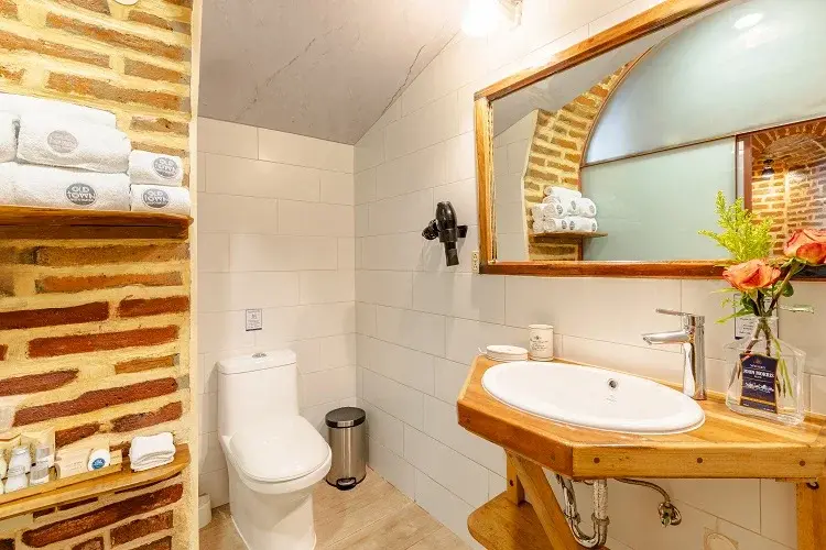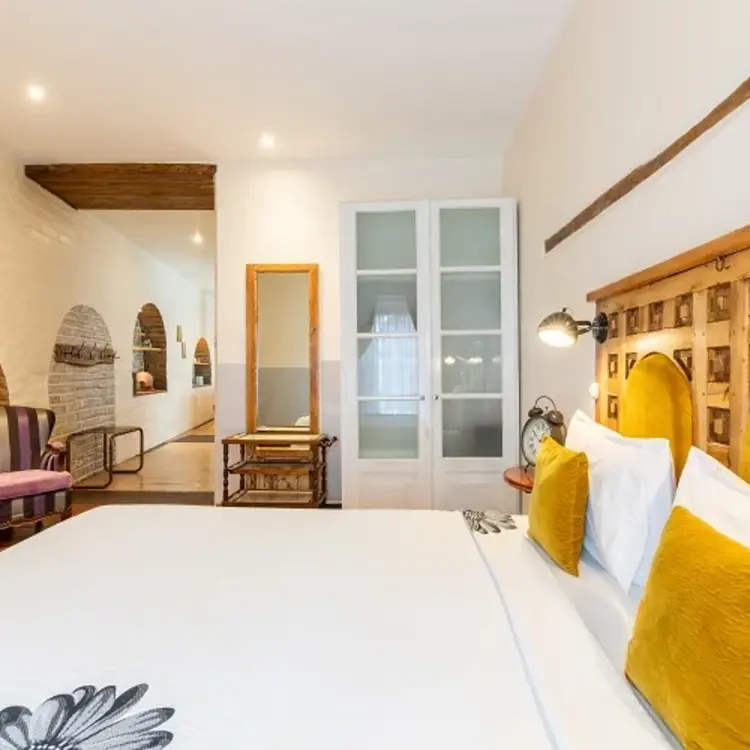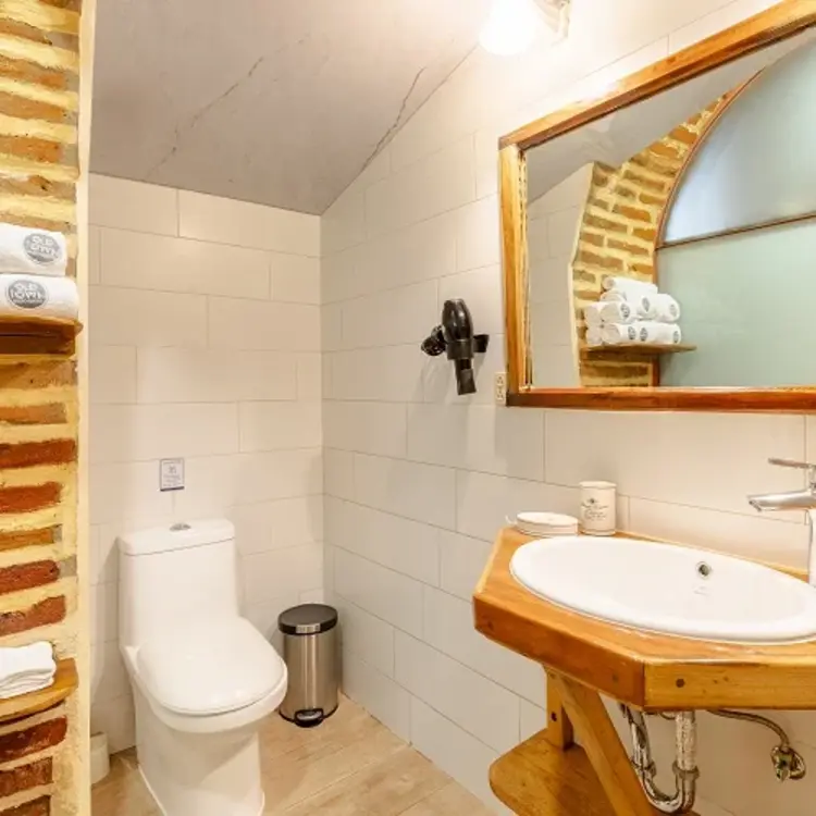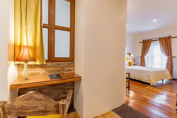 As one of the largest luxury suites in our design hotel in Quito, this ground-floor suite exudes historic charm while offering modern comforts. It features a fully equipped kitchen and dining area, perfect for guests who appreciate the flexibility of preparing their own meals during their stay. Moreover, an expansive lounge that boasts a cozy ledge fireplace, along with a huge comfortable sofa with stylish design armchairs will enhance your comfort. The standout feature is the impressive hand-pointed brick arches, adding a touch of elegance to your stay in one of the finest small luxury hotels in Quito.