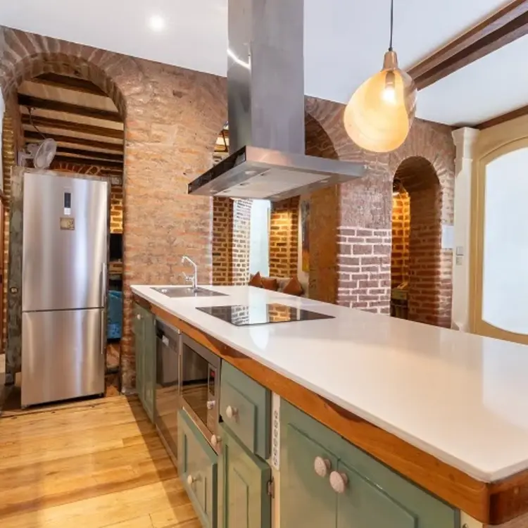 As one of the largest luxury suites in our design hotel in Quito, this ground-floor suite exudes historic charm while offering modern comforts. It features a fully equipped kitchen and dining area, perfect for guests who appreciate the flexibility of preparing their own meals during their stay. Moreover, an expansive lounge that boasts a cozy ledge fireplace, along with a huge comfortable sofa with stylish design armchairs will enhance your comfort. The standout feature is the impressive hand-pointed brick arches, adding a touch of elegance to your stay in one of the finest small luxury hotels in Quito.